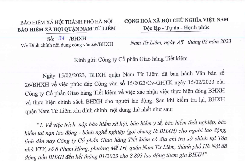 Tuy nhiên cùng ngày, Tạp chí Doanh nghiệp Việt Nam nhận được công văn phản hồi từ Giao hàng Tiết kiệm kèm theo công văn của BHXH quận Nam Từ Liêm (Hà Nội) ngày 15/2/2023 khẳng định doanh nghiệp này đã đóng đủ bảo hiểm xã hội cho các lao động đến hết tháng 1/2023.