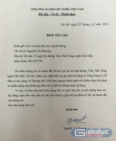 Báo điện tử Giáo dục Việt Nam nhận được đơn thư tố cáo của ông Nguyễn Chí Phương, địa chỉ: Số 12 ngõ 28, đường Trần Thái Tông (Cầu Giấy, Hà Nội) đối với Tổng công ty Cổ phần Đầu tư Xây dựng và Thương mại Việt Nam (CTX HOLDINGS) ngang nhiên quây tôn, chiếm đoạt trái phép mảnh đất 245m2 tại mặt đường Trần Thái Tông (phường Dịch Vọng) trong nhiều tháng nay của gia đình ông.