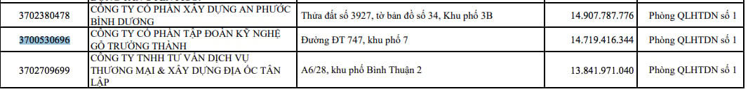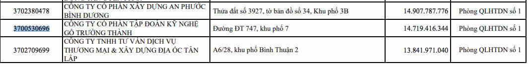 Trong danh sách công khai có đề cập đến Công ty cổ phần Tập đoàn Kỹ nghệ gỗ Trường Thành (gọi tắt Gỗ Trường Thành). Địa chỉ tại đường ĐT 747, khu phố 7, phường Uyên Hưng, thành phố Tân Uyên, tỉnh Bình Dương. Hiện công ty đang có số nợ tiền thuế là hơn 14,7 tỷ đồng.