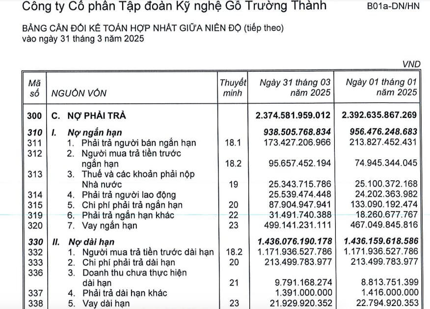 Nợ phải trả của Gỗ Trường Thành đến ngày 31/12/2025 ghi nhận gần 2.374,6 tỷ đồng. Trong đó, nợ ngắn hạn hơn 938,5 tỷ đồng và nợ dài hạn gần 1.436,1 tỷ đồng.