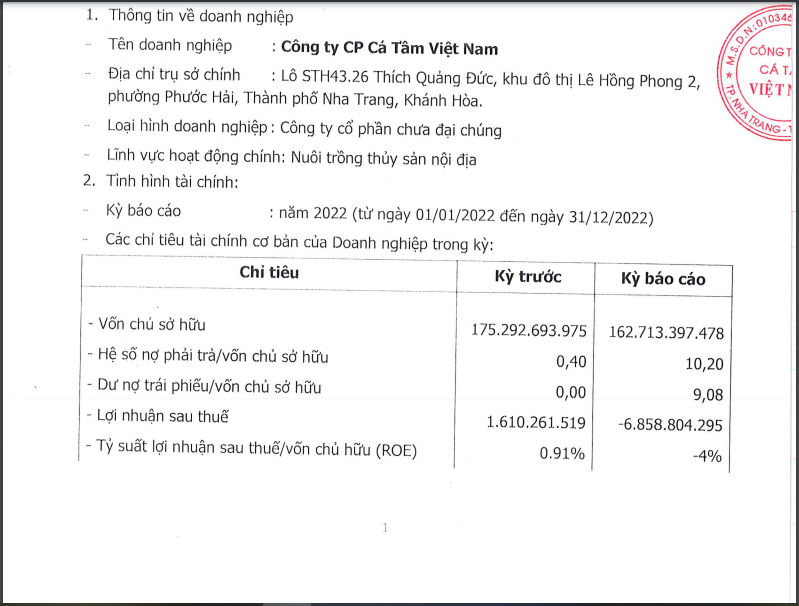 Cụ thể, cũng theo báo cáo tài chính năm 2022 của CTCP Cá Tầm Việt Nam cho thấy, kết thúc năm vừa qua, doanh nghiệp báo lỗ 6,86 tỷ đồng (trong khi năm 2021 lãi 1,6 tỷ đồng).