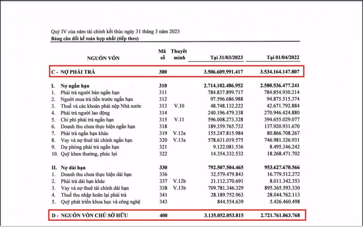Tuy nhiên, báo cáo tài chính của CMC cho thấy, tại thời điểm 31/32023, nợ phải trả của doanh nghiệp ở mức hơn 3.506 tỷ đồng. Như vậy, so với mức vốn chủ sở hữu, số nợ phải trả của Tập đoàn CMC gấp khoảng 1,12 lần.