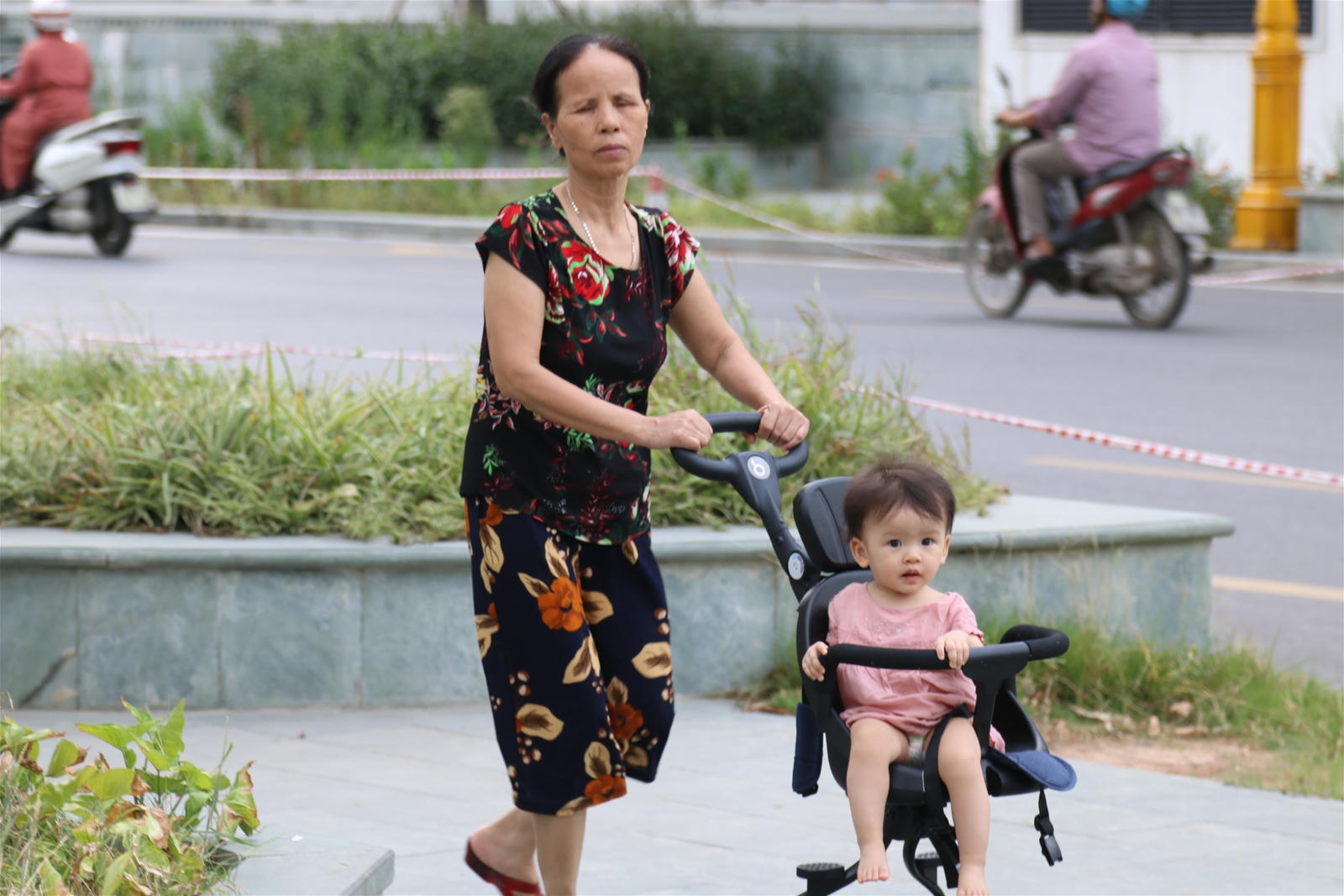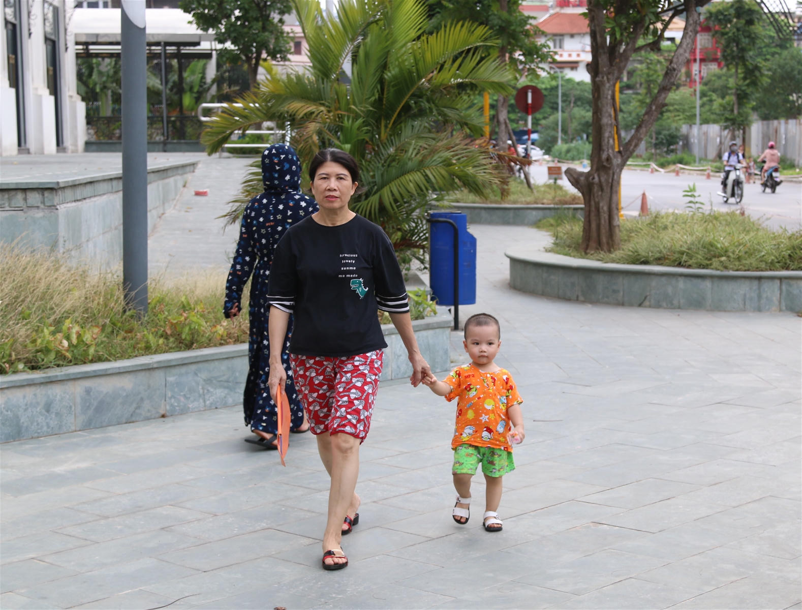 Đều đặn chiều nào cũng vậy, bà Nguyễn Thị Tâm (57 tuổi, quê Nghệ An) cũng đưa cháu nội xuống dưới chân tòa nhà Eco Lake View để “đổi gió”. Nhưng sân đông người, lại không có ghế đá nên bà thường ôm cháu ngồi tạm chỗ nào sành sạch. Bà Tâm cho biết, ở chung cư này đến vườn hoa hay khuôn viên sạch sẽ cho trẻ con chơi còn không có, nói gì đến sân tập thể dục hay chỗ đi dạo cho người già.