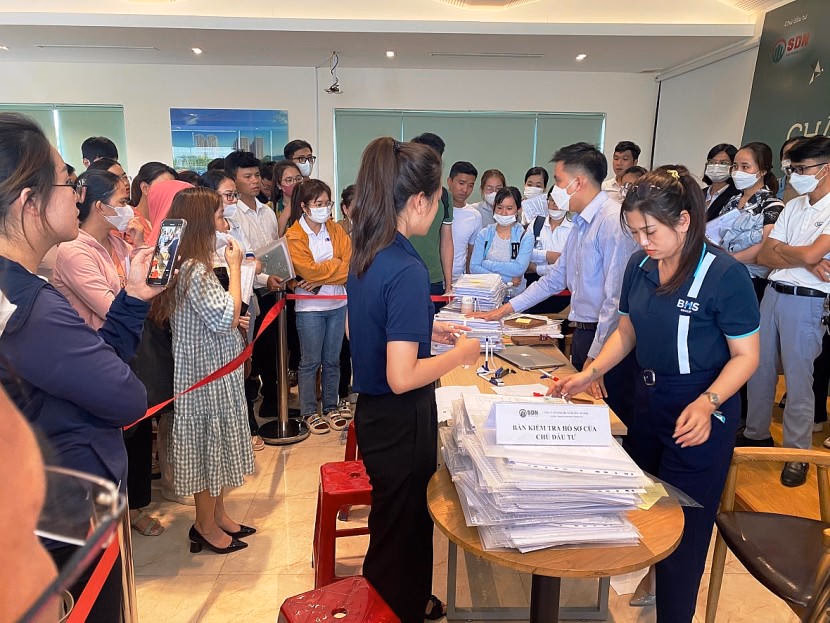 | Hàng trăm người dân xếp hàng từ 4 giờ sáng chờ một hồ sơ mua nhà ở xã hội tại Khu đô thị xanh Bàu Tràm Lakeside. |