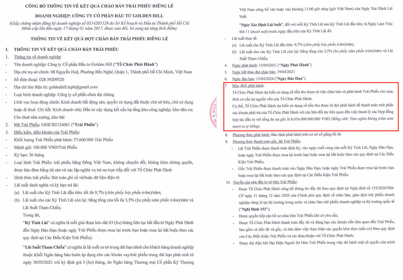 Cụ thể, chỉ trong thời gian ngắn từ 15/4 đến ngày 19/4/2021, CTCP Đầu tư Golden Hill đã phát hành thành công 5.760 tỷ đồng trái phiếu mã GHICB2124001, kỳ hạn 4 năm (đáo hạn ngày 15/4/2025). Đây là lô trái phiếu không chuyển đổi, không kèm chứng quyền, có tài sản bảo đảm. Lãi suất cho kỳ tính lãi đầu tiên là 9,7%/năm. Các kỳ tính lãi tiếp theo, lãi suất bằng tổng tối đa 3,5% cộng lãi suất tham chiếu.