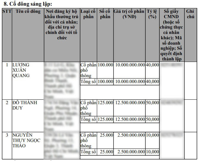 Công ty cổ phần Hóa chất và Vật liệu điện Sài Gòn ban đầu có vốn điều lệ là 25 tỷ đồng. Trong đó, Đỗ Thành Duy góp 12,5 tỷ đồng, sở hữu 50% cổ phần; Nguyễn Thụy Ngọc Thảo góp 2,5 tỷ đồng, sổ hữu 10% cổ phần; 40% cổ phần còn lại thuộc về Lương Xuân Quang, với 10 tỷ đồng vốn góp.