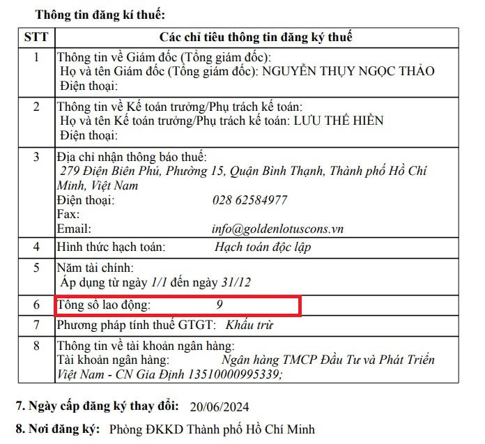 Trên website, Golden Lotus Construction công bố có hơn 1.000 nhân sự. Mặc dù vậy, thay đổi đăng ký doanh nghiệp cập nhật mới nhất vào tháng 6/2024 thì tổng số lao động của Golden Lotus Construction là 9 người.