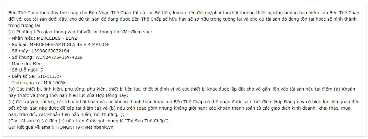 Tháng 4/2024, Golden Lotus Construction thế chấp một xe ô tô nhãn hiệu Mercedes GLA 45s 4Matic+, biển số 51L-112.27 tại Ngân hàng TMCP Công thương Việt Nam – chi nhánh 4 TP. HCM.