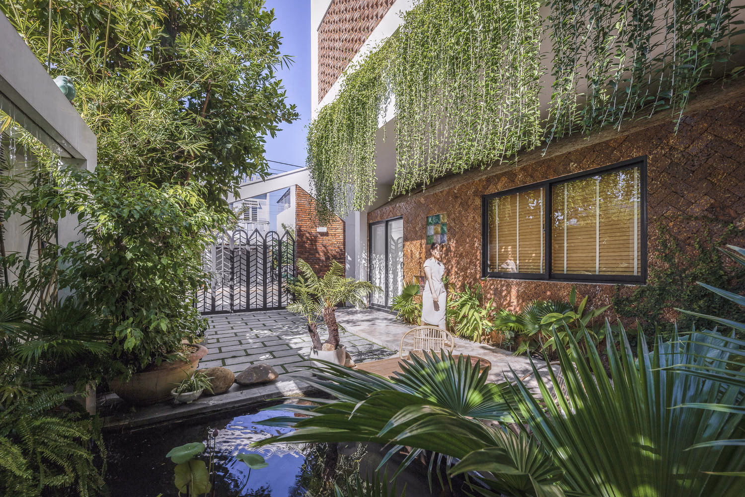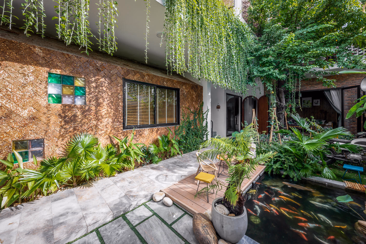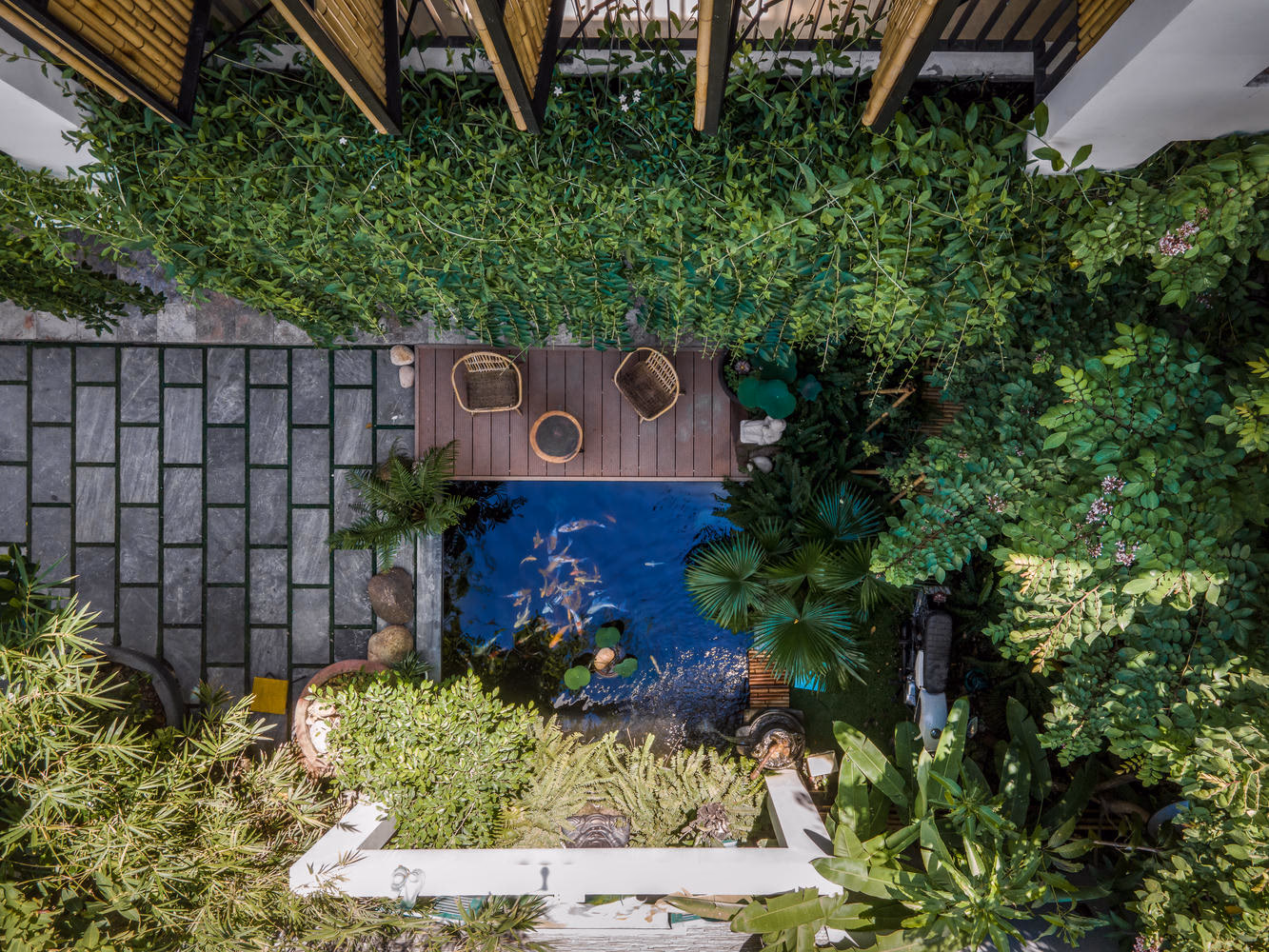 Ngoài ra, một khu vườn lớn nằm song song với khu vực làm việc và vuông góc với không gian sống. Ở miền Trung, đặc biệt là Đà Nẵng vào mùa hè luôn có nguồn gió phơn (gió khô và nóng) nên thiết kế hồ cá Koi đặt trước hướng gió có hơi nước để giảm sức nóng của nguồn gió này.