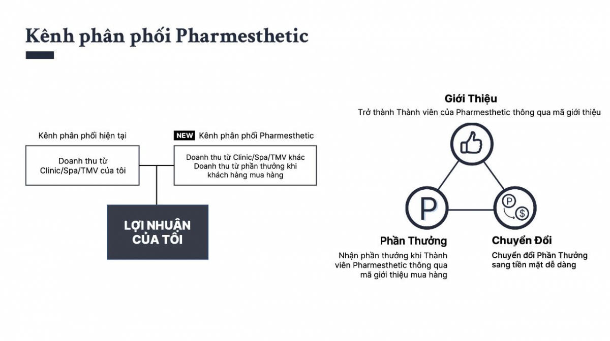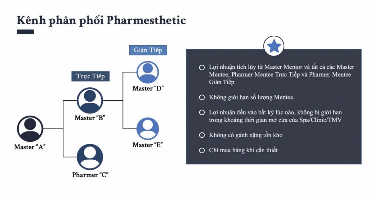 Cụ thể, giới thiệu mô hình phân phối Pharmesthetic khác so với các mô hình phân phân phối hiện tại là tỷ lệ quay vòng cao hơn gấp 10 lần. Lợi nhuận đến từ nhiều nguồn: 30% lợi nhuận từ Master trực tiếp, 30% lợi nhuận từ Pharmer trực tiếp, 30% lợi nhuận từ Pharmer Gián tiếp. Lợi nhuận sẽ tích luỹ từ các Master chính và tất cả các master và pharmer xung quanh Master chính. Không giới hạn số lượng Mentee. Ví dụ, Master A, khi đăng ký nhập hàng 50 triệu trên một website tên là Givehada, sẽ được cấp 1 mã code, và ngoài được nhận hoa hồng 30%, sẽ nhận được hoa hồng từ Master B trực tiếp, rồi gián tiếp như Master D, Master E…