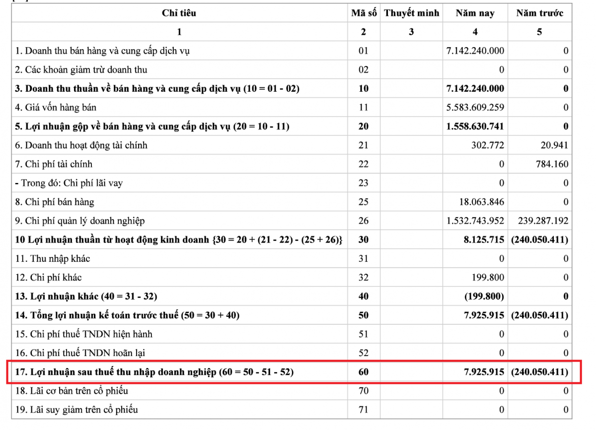Trong báo cáo tài chính của doanh nghiệp này, năm 2022 doanh nghiệp không ghi nhận doanh thu, đồng thời báo lỗ ròng hơn 240 triệu đồng. Bước sang năm 2023, doanh thu công ty đạt 7 tỷ đồng, lợi nhuận sau thuế gần 8 triệu đồng. Tuy nhiên số lãi ít ỏi này không đủ để vá số tiền đã thua lỗ trước đó, kết quả, tại ngày 31/12/2023, doanh nghiệp này đang gánh khoản lỗ luỹ kế hơn 241 triệu đồng.