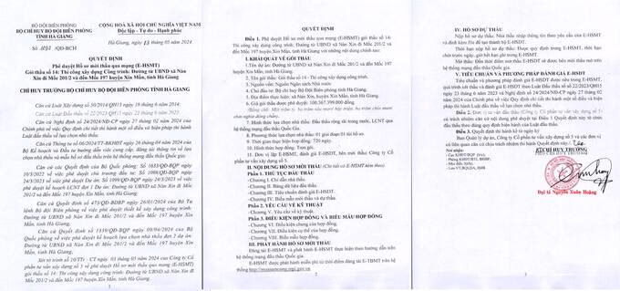 Phó Chỉ huy trưởng Bộ đội Biên phòng tỉnh Hà Giang - Đại tá Nguyễn Xuân Hoàng mới đây đã ký quyết định số 1092/QĐ-BCH vào ngày 3/5/2024, phê duyệt Hồ sơ mời thầu Gói thầu số 14: Thi công xây dựng Công trình.