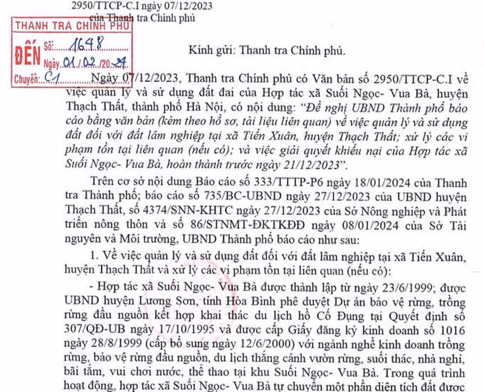 Ngày 7/12/2023, Thanh tra Chính phủ có văn bản đề nghị UBND TP. Hà Nội báo cáo việc quản lý và sử dụng đất đai của Hợp tác xã Suối Ngọc - Vua Bà, huyện Thạch Thất. Văn bản này cũng yêu cầu TP Hà Nội giải quyết khiếu nại của Hợp tác xã Suối Ngọc - Vua Bà.