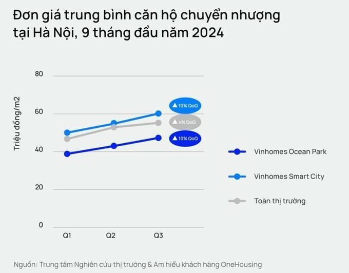 Kết thúc quý 3/2024, thị trường căn hộ sơ cấp tại Hà Nội ghi nhận mức giá trung bình đạt gần 80,5 triệu đồng/m2 (bao gồm VAT và kinh phí bảo trì), tăng 7,6% so với quý trước.