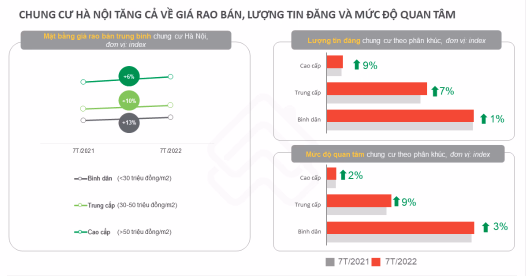 Trong 7 tháng đầu năm nay, chung cư là loại hình BĐS duy nhất của Hà Nội có lượng quan tâm tăng. Các phân khúc căn hộ bình dân, trung cấp và cao cấp lần lượt tăng 3%, 9% và 2% về mức độ quan tâm so với cùng kỳ năm trước. Mặt bằng giá rao bán căn hộ Hà Nội cũng tăng từ 6% đến 13% so với cùng kỳ năm 2021. Mức tăng này còn cao hơn so với tốc độ tăng giá của căn hộ chung cư ở TP.HCM (tăng từ 4% đến 8%).
