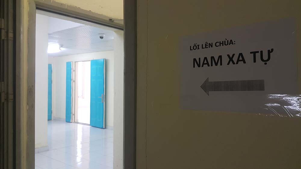 Theo hướng dẫn trên mảnh giấy, từ tầng 30 phóng viên đi tiếp (bằng thang bộ) thêm 1 tầng nữa. Tại khuôn viên tầng này có một cầu đi bộ bằng sắt. Tiếp tục đi lên chiếc cầu này thì đến được ngôi chùa ở trên tầng trên cùng của tòa nhà.