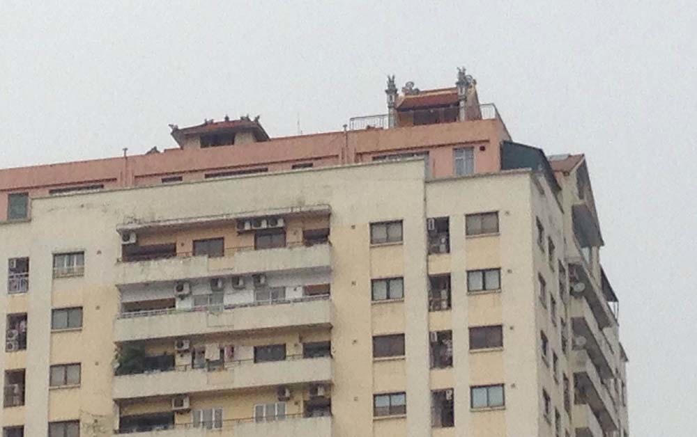 TNNĐ- Ngay trên nóc các tòa nhà cao tầng giữa Thủ đô xuất hiện những ngôi chùa khá rộng rãi với đầy đủ tượng phật, có cả người bảo vệ.