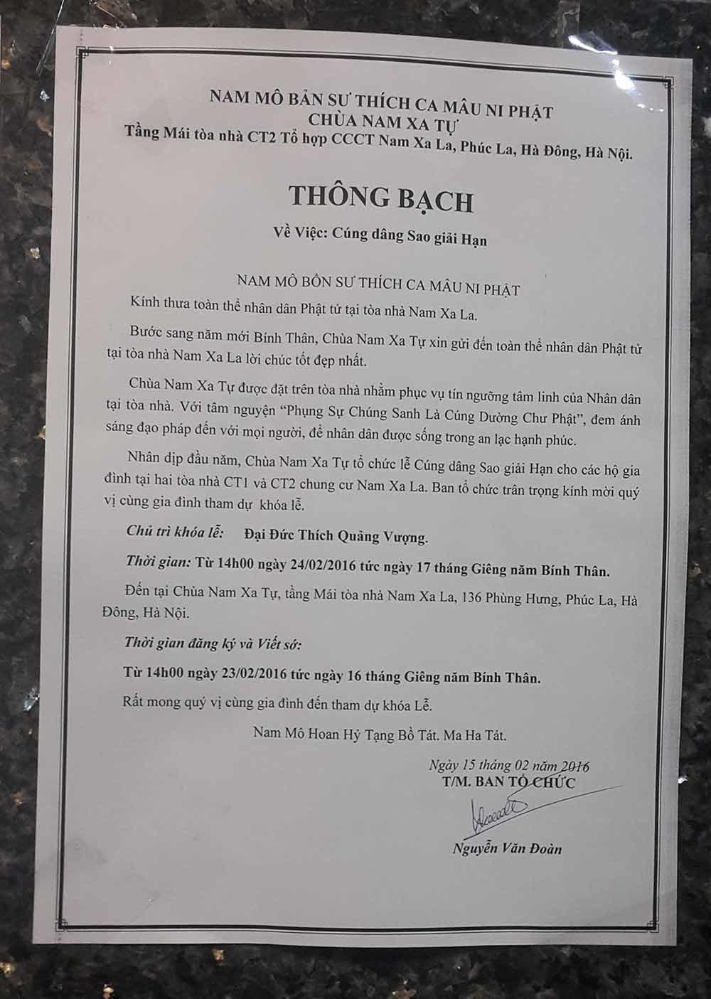 Cũng tại thông báo này, ngôi chùa được đặt tên là “Nam Xa Tự”. Việc giải hạn cũng được ban tổ chức tòa nhà mời thầy về cúng và bắt đầu từ 14g ngày 24/2 (tức 17/1 âm lịch).