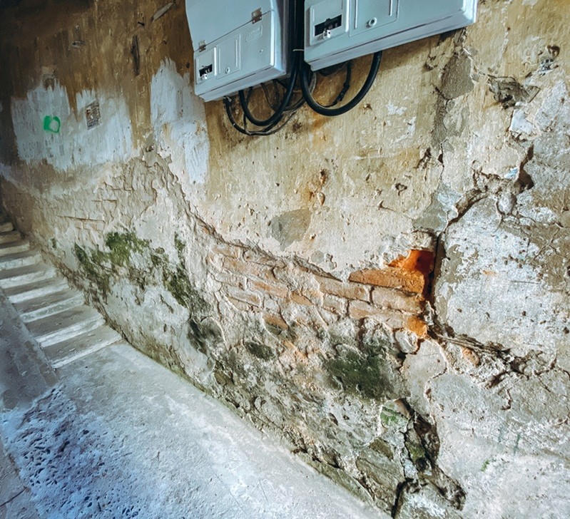 Lớp vôi vữa ở tầng 1 đã bong tróc.