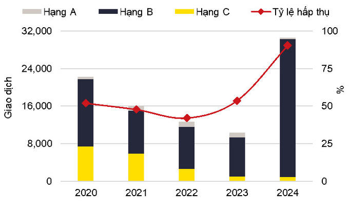 Hai đô thị này chiếm 89% nguồn cung chung cư mới toàn thị trường Hà Nội trong năm 2024. Tỉ lệ hấp thụ căn hộ năm 2024 đạt 85% tổng nguồn cung thị trường, các chủ đầu tư không còn lo hàng tồn kho. Về giá bán, theo khảo sát của Savills Việt Nam tại Hà Nội, căn hộ có giá bán trên 4 tỉ đồng chiếm 59% tổng lượng giao dịch thành công, tăng mạnh so với tỉ lệ 2% của năm 2020.
