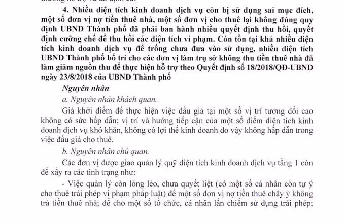UBND TP Hà Nội xác định: Nhiều diện tích kinh doanh dịch vụ còn bị sử dụng sai mục đích, một số đơn vị nợ tiền thuê nhà, một số đơn vị cho thuê lại không đúng quy định UBND Thành phố đã phải ban hành nhiều quyết định thu hồi, quyết định cưỡng chế để thu hồi các diện tích vi phạm.