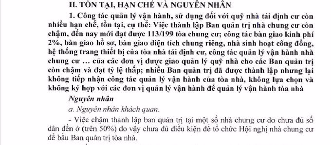Trong đó, sau khi thành lập được Ban quản trị các đơn vị được giao quản lý vận hành còn chậm trong việc bàn giao kinh phí 2%, bàn giao hồ sơ, bàn giao diện tích chung riêng, nhà sinh hoạt cộng đồng, hệ thống trang thiết bị của tỏa nhà tái định cư, công tác quản lý vận hành nhà chung cư ... cho các Ban quản trị quản lý theo quy định.