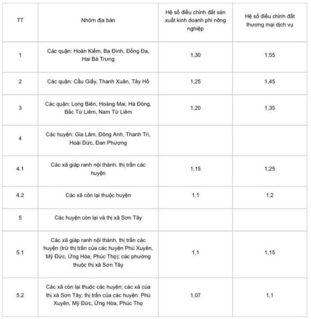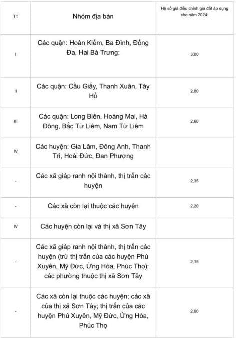 Ngoài ra, hệ số điều chỉnh giá đất năm 2024 đối với các trường hợp áp dụng hệ số theo quy định của pháp luật, để làm căn cứ tính: Thu tiền thuê đất, xác định giá khởi điểm để đấu giá quyền sử dụng đất thuê; thu tiền sử dụng đất đối với hộ gia đình, cá nhân được Nhà nước công nhận quyền sử dụng đất, cho phép chuyển mục đích sử dụng đất đối với diện tích đất ở vượt hạn mức trên địa bàn TP. Hà Nội, cụ thể: