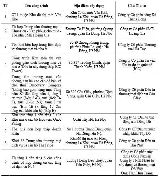 Tại Hà Nội, những toà nhà vi phạm bao gồm: Tòa nhà CT1 thuộc Khu đô thị mới Văn Khê (phường La Khê, quận Hà Đông) do Công ty Cổ phần sông Đà Thăng Long làm chủ đầu tư.