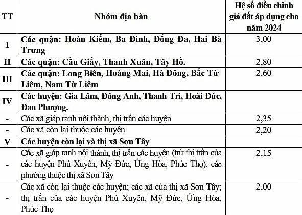 Hệ số điều chỉnh giá đất năm 2024 làm căn cứ thu tiền thuê đất, xác định giá khởi điểm để đấu giá quyền sử dụng đất; thu tiền sử dụng đất đối với hộ gia đình, cá nhân được Nhà nước công nhận quyền sử dụng đất, cho phép chuyển mục đích sử dụng đất đối với diện tích đất ở vượt hạn mức trên địa bàn thành phố Hà Nội được quy định như sau: