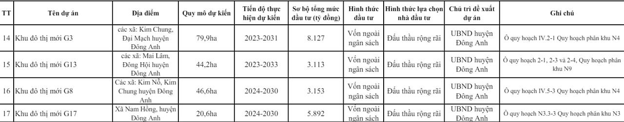 Trong danh sách 36 dự án, tại huyện Đông Anh có 6 dự án khu đô thị đang được thành phố kêu gọi đầu tư. Cụ thể, dự án khu đô thị mới G3 (gần 80ha, 8.127 tỷ đồng) nằm tại các xã Kim Chung, Đại Mạch; khu đô thị mới G13 (hơn 44ha, 3.113 tỷ đồng) nằm tại xã Mai Lâm, Đông Hội; khu đô thị mới G8 (46,6ha, 3.153 tỷ đồng) tại xã kim Nỗ, Kim Chung; khu đô thị mới G17 (20,6ha, 5.892 tỷ đồng) tại xã Nam Hồng.