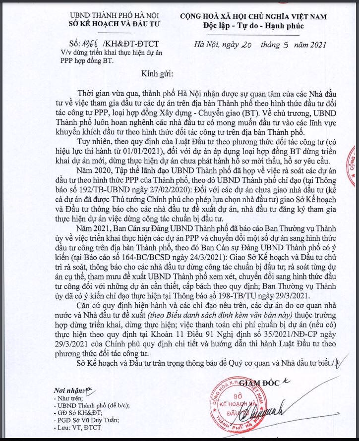 UBND Hà Nội vừa ban hành văn bản số 1966/KH&ĐT-ĐTCT về việc dừng triển khai thực hiện 82 dự án theo hợp đồng xây dựng - chuyển giao (BT).