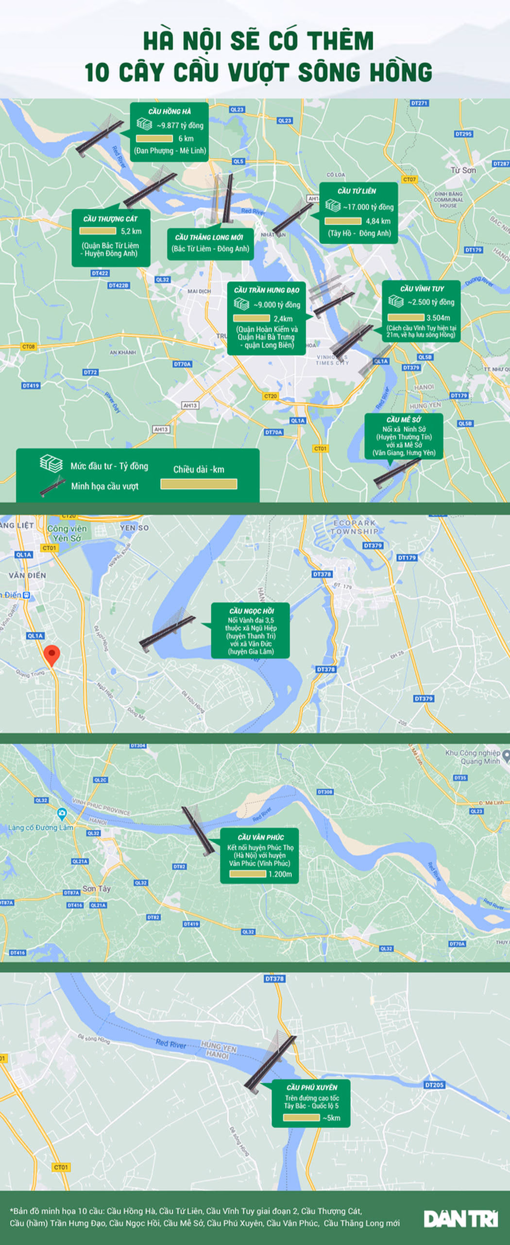 - Cầu Hồng Hà dài 6km, nối huyện Đan Phượng với huyện Mê Linh. Tổng vốn đầu tư dự kiến 9.877 tỷ đồng.
