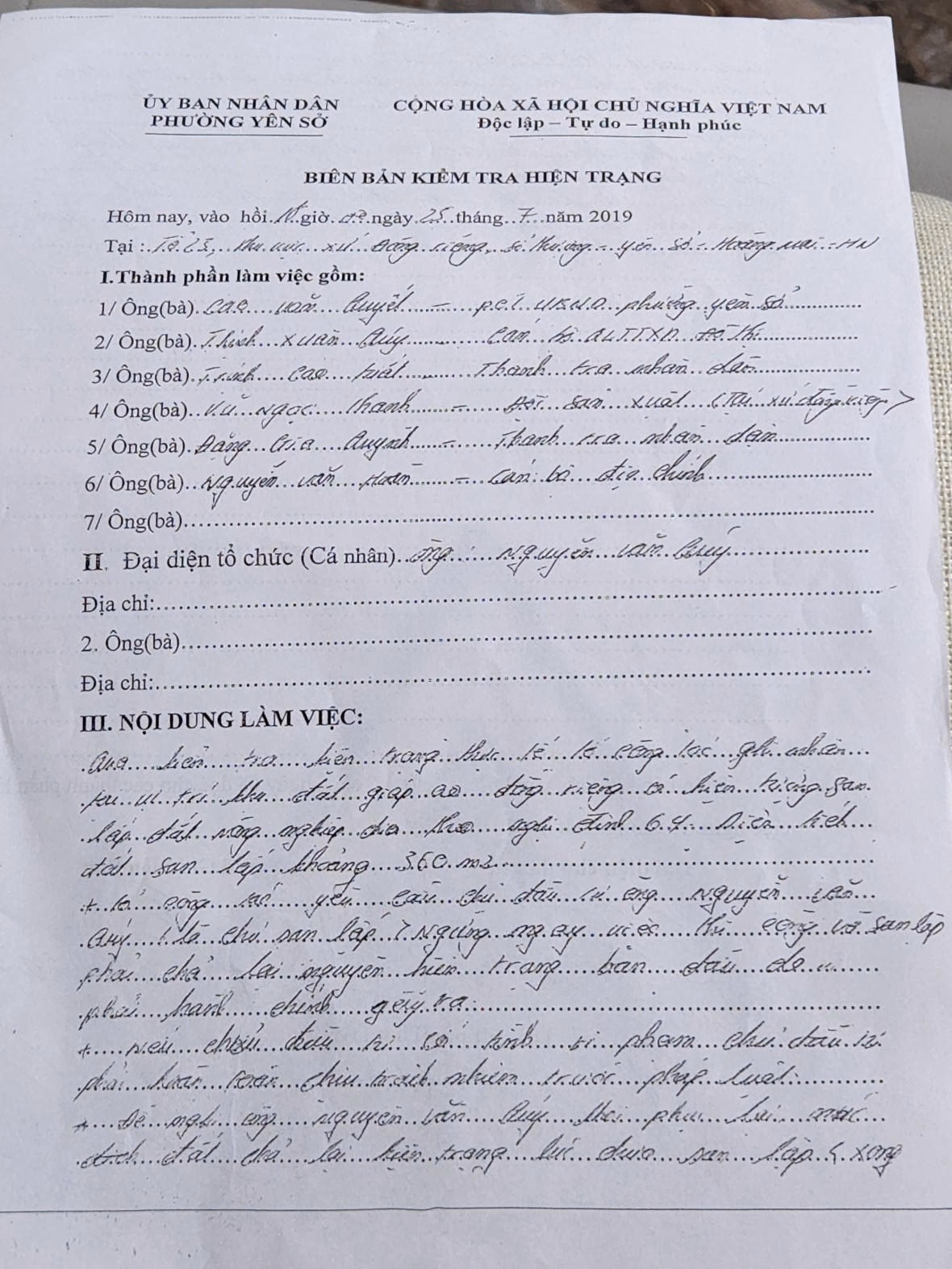 | Biên bản kiểm tra hiện trạng của UBND phường Yên Sở đối với vi phạm của gia đình ông Nguyễn Văn Quý. |