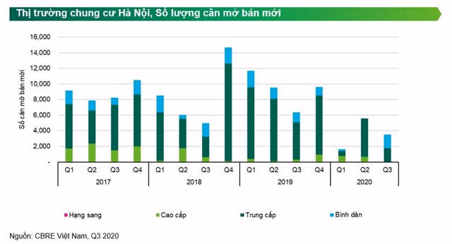 Cụ thể, đối với phân khúc chung cư, trong chín tháng đầu năm 2020, thị trường Hà Nội ghi nhận 10.700 căn mở bán mới, giảm 61% so với cùng kỳ năm trước. Riêng quý 3/2020 ghi nhận 3.500 căn mở bán mới.