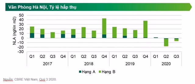 CBRE nhận định, tình hình hoạt động của thị trường văn phòng Hà Nội tiếp tục gặp khó khăn từ làn sóng covid – 19 lần thứ hai, do một số khách thuê tiếp tục thu hẹp diện tích văn phòng. Tổng diện tích hấp thụ của văn phòng Hà Nội trong quý 3/2020 đạt - 6.500 m2.