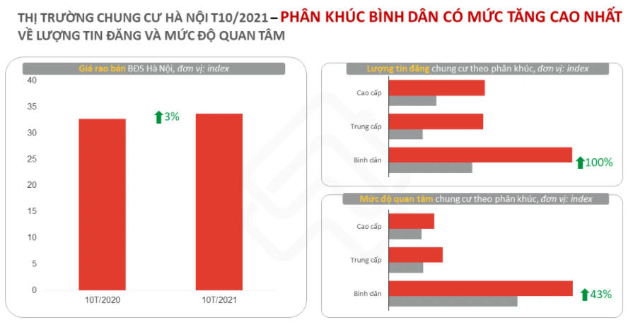 Nếu xét về loại hình căn hộ chung cư tại thị trường Hà Nội, theo thống kê của đơn vị này, giá rao bán ghi nhận tăng 3% so với cùng kỳ năm ngoái. Trong đó, phân khúc căn hộ bình dân ghi nhận cả nguồn cung lẫn nguồn cầu tăng lần lượt 100% và 43% so với tháng 9.