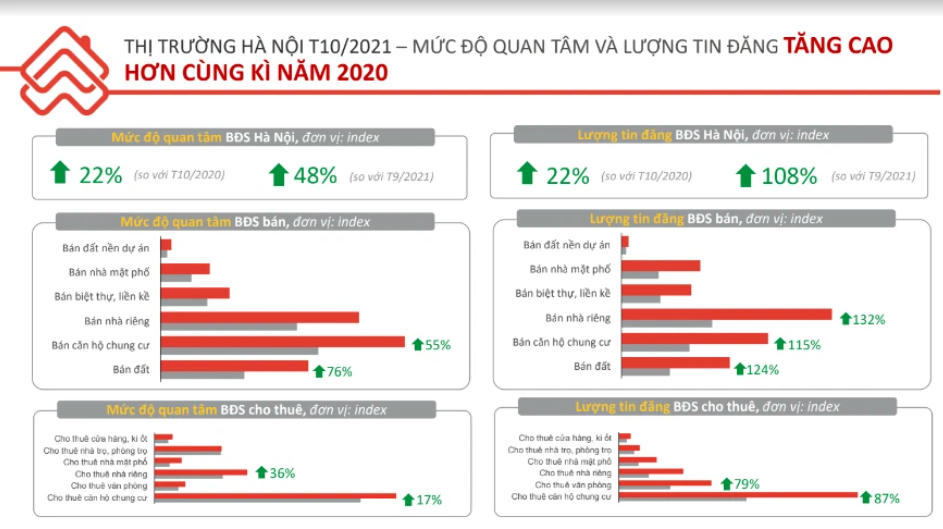 Thị trường tại Hà Nội, mức độ quan tâm và lượng tin đăng đều tăng 22% so với cùng kỳ năm ngoái nhưng tăng mạnh lần lượt 48% và 108% so với tháng 9.