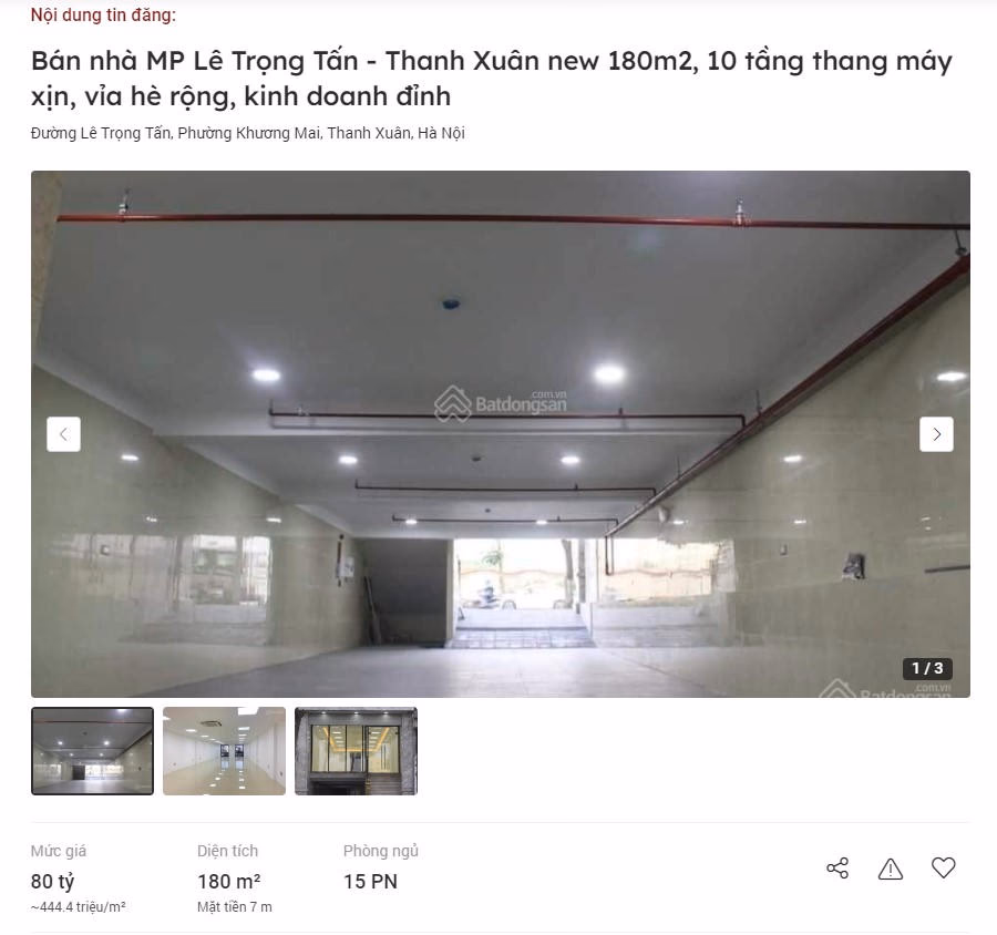 Theo khảo sát trên chuyên trang Batdongsan.com.vn, một tòa nhà tại mặt phố Lê Trọng Tấn - Thanh Xuân có diện tích 180m2 đang được rao bán với giá 444,4 triệu đồng/m2 (tương đương 80 tỷ đồng).