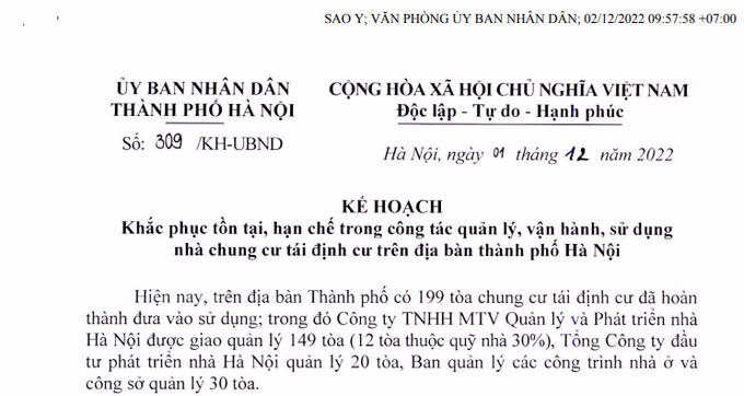 Kế hoạch số 309/KH-UBND (ngày 1-12-2022) khắc phục tồn tại, hạn chế trong quản lý, vận hành, sử dụng nhà chung cư tái định cư.