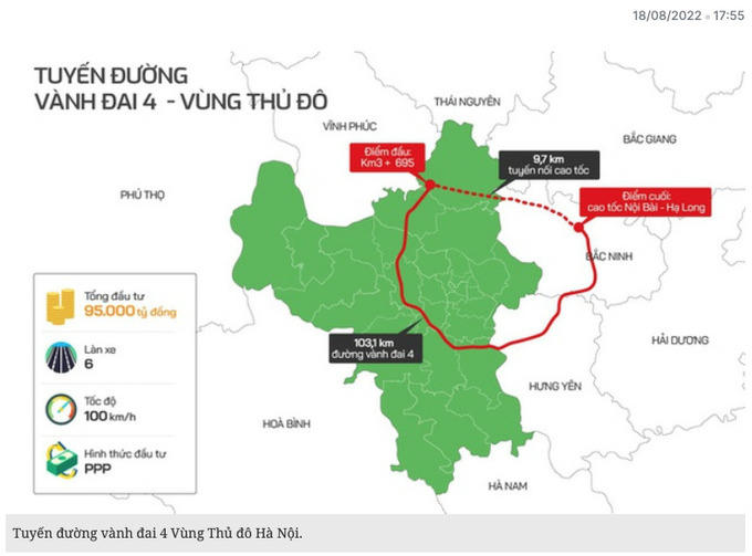 Dự án đường vành đai 4 – Vùng Thủ Đô dự kiến chiều dài khoảng 112km, đi qua địa phận 3 tỉnh, thành phố gồm Hà Nội, Hưng Yên và Bắc Ninh và đoạn tuyến nối với quốc lộ 18. Trong đó khu vực Hà Nội đi qua 7 quận, huyện gồm Sóc Sơn, Mê Linh, Đan Phượng, Hoài Đức, Thanh Oai, Thường Tín và Hà Đông. Tỉnh Hưng Yên đi qua 4 huyện gồm Văn Giang, Khoái Châu, Yên Mỹ, Văn Lâm và Tỉnh Bắc Ninh đi qua 3 huyện gồm Thuận Thành, Quế Võ và Gia Bình. Bên cạnh đó có gần chục km đường nối từ cuối đường Vành đai 4, từ cao tốc Nội Bài - Hạ Long theo quy hoạch đến cao tốc Hà Nội - Bắc Giang nhằm khép kín dự án.