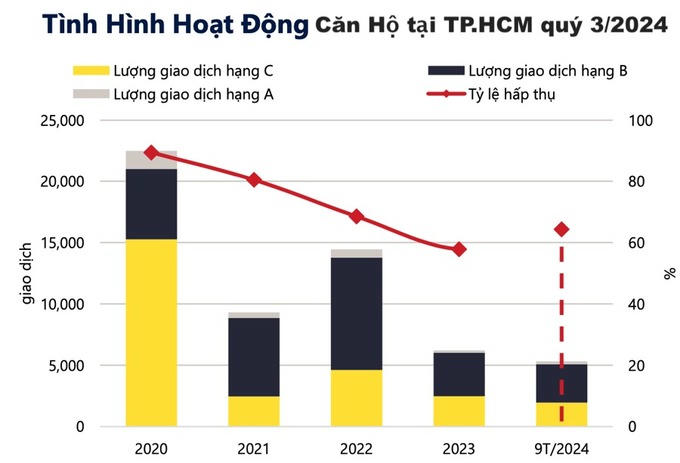 Mặc dù nguồn cung hạn chế, thị trường vẫn duy trì hoạt động sôi động với 6.840 căn hộ được bán ra trong quý III, tăng 35% so với quý trước và 226% so với cùng kỳ năm ngoái. Trong số đó, căn hộ hạng B chiếm ưu thế với tỷ lệ hấp thụ của nguồn cung mới đạt 85%.