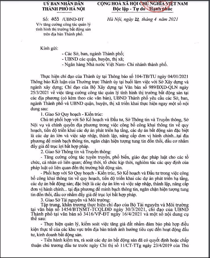 Trước tình hình đó, UBND TP Hà Nội đã ban hành Văn bản số 1153/UBND-ĐT về tăng cường công tác quản lý thị trường bất động sản trên địa bàn thành phố. Trong đó, yêu cầu sở ngành, địa phương công bố công khai thông tin về quy hoạch, tiến độ triển khai các dự án để ngăn chặn việc tung tin đồn, tạo sốt đất ảo.