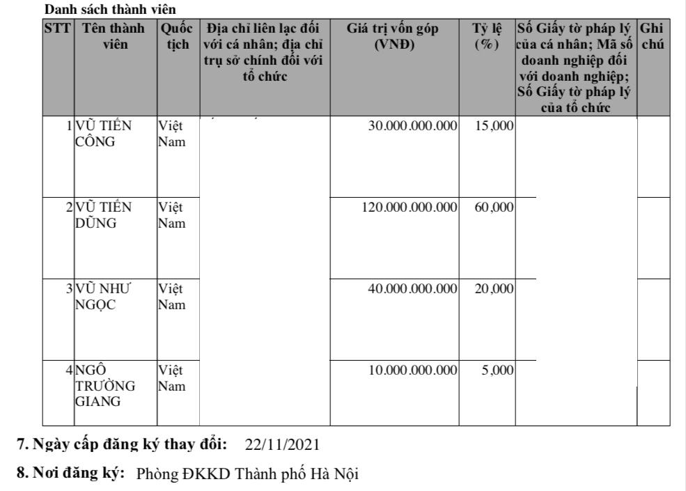 Tiếp đó, đến thang 9/2021, công ty nâng vốn điều lệ lên 180 tỷ đồng. Cổ đông góp vốn gồm: Vũ Tiến Công góp 30 tỷ đồng (tỷ lệ 16,667%); Vũ Tiếng Dũng góp 100 tỷ đồng (tỷ lệ 55,556%); Vũ Như Ngọc góp 40 tỷ đồng (tỷ lệ 22,222%) và Ngô Trường Gia góp 10 tỷ đồng (tỷ lệ 5,556%).