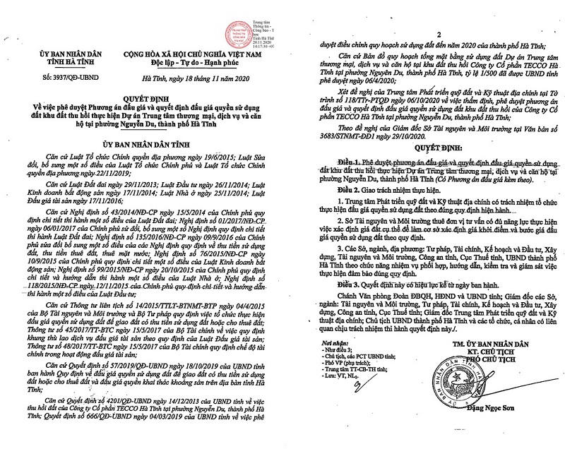 UBND tỉnh Hà Tĩnh vừa ký Quyết định số 3937/QĐ-UBND về việc đấu giá quyền sử dụng đất khu đất thu hồi từ Công ty CP TECCO Hà Tĩnh. Theo đó khu đất Dự án Trung tâm thương mại, dịch vụ và căn hộ tại phường Nguyễn Du rộng gần 16.000 m2 sẽ được bán đấu giá trong quý IV/2020 – quý I/2021.