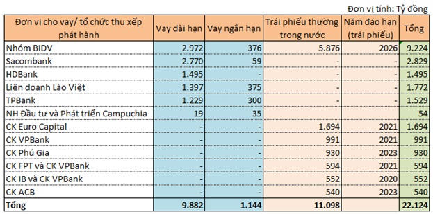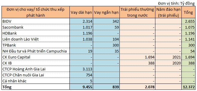 Tại HNG, chủ nợ lớn nhất là BIDV với 342 tỷ vay ngắn hạn và 2.313,5 tỷ vay dài hạn. HNG cũng nợ dài hạn HDBank và Sacombank, Ngân hàng Liên doanh Lào Việt – Chi nhánh Attapeu trên 1.000 tỷ đồng mỗi đơn vị.