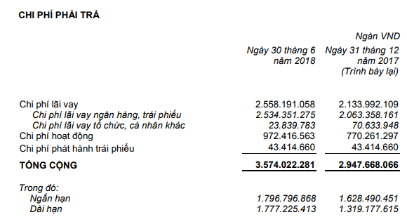 Theo BCTC hợp nhất quý II, tại thời điểm cuối quý, HAG có khoản nợ vay 23.160 tỷ đồng gồm 2.965 tỷ đồng ngắn hạn và 20.196 tỷ đồng dài hạn. Chi phí lãi vay 6 tháng đầu năm 2018 của HAGL là hơn 805 tỷ đồng, tổng chi phí lãi vay phải trả tại thời điểm 30/6/2018 là hơn 2.530 tỷ đồng.