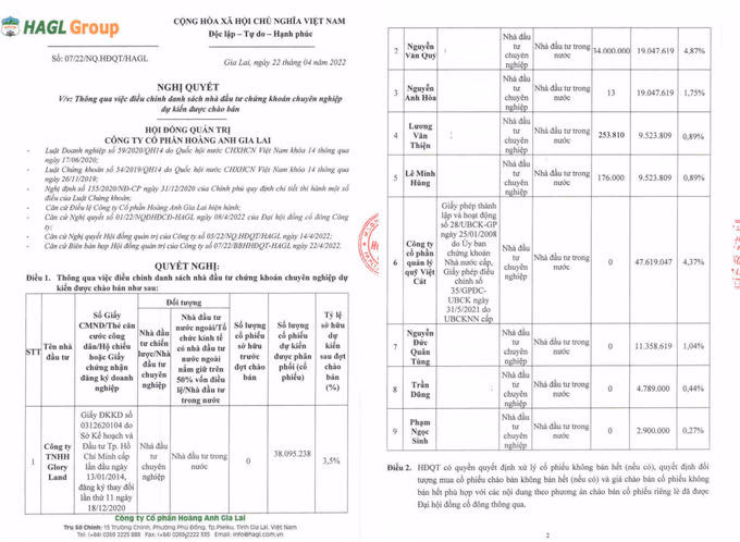 Trước đó, vào hồi tháng 4, HAGL cũng công bố điều chỉnh danh sách nhà đầu tư tham gia đợt chào bán cổ phần riêng lẻ. Theo đó, danh mục nhà đầu tư điều chỉnh tăng lên thành 9 nhà đầu tư so với chỉ 3 nhà đầu tư công bố trước.