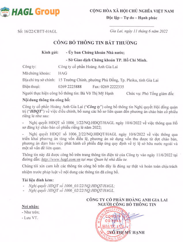Mới đây, CTCP Hoàng Anh Gia Lai (HAGL) công bố Nghị quyết của Hội đồng Quản trị thông qua phương án cháo bán gần 162 triệu cổ phiếu riêng lẻ để tăng vốn điều lệ của công ty theo nghị quyết ngày 8/4/2022 của ĐHĐCĐ thường niên năm 2022.