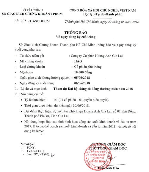 Mới đây, Sở Giao dịch Chứng khoán TP. Hồ Chí Minh đã đã thông báo, ngày 06/06 tới đây là ngày đăng ký cuối cùng để cổ đông thực hiện quyền tham dự ĐHCĐ thường niên năm 2018 cả CTCP Hoàng Anh Gia Lai – HAGL (Mã CK: HAG).