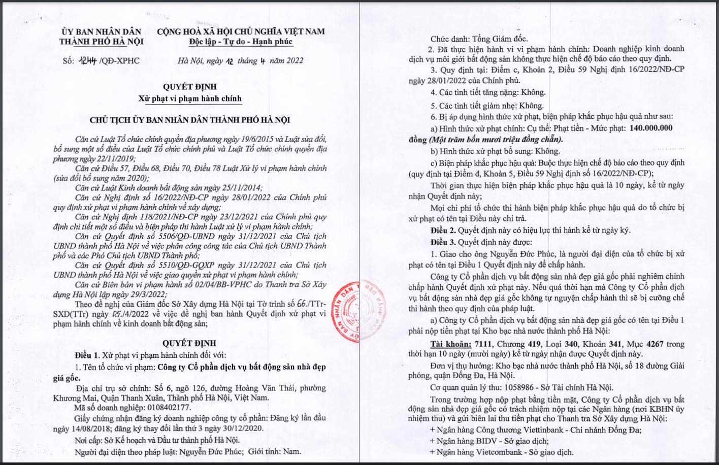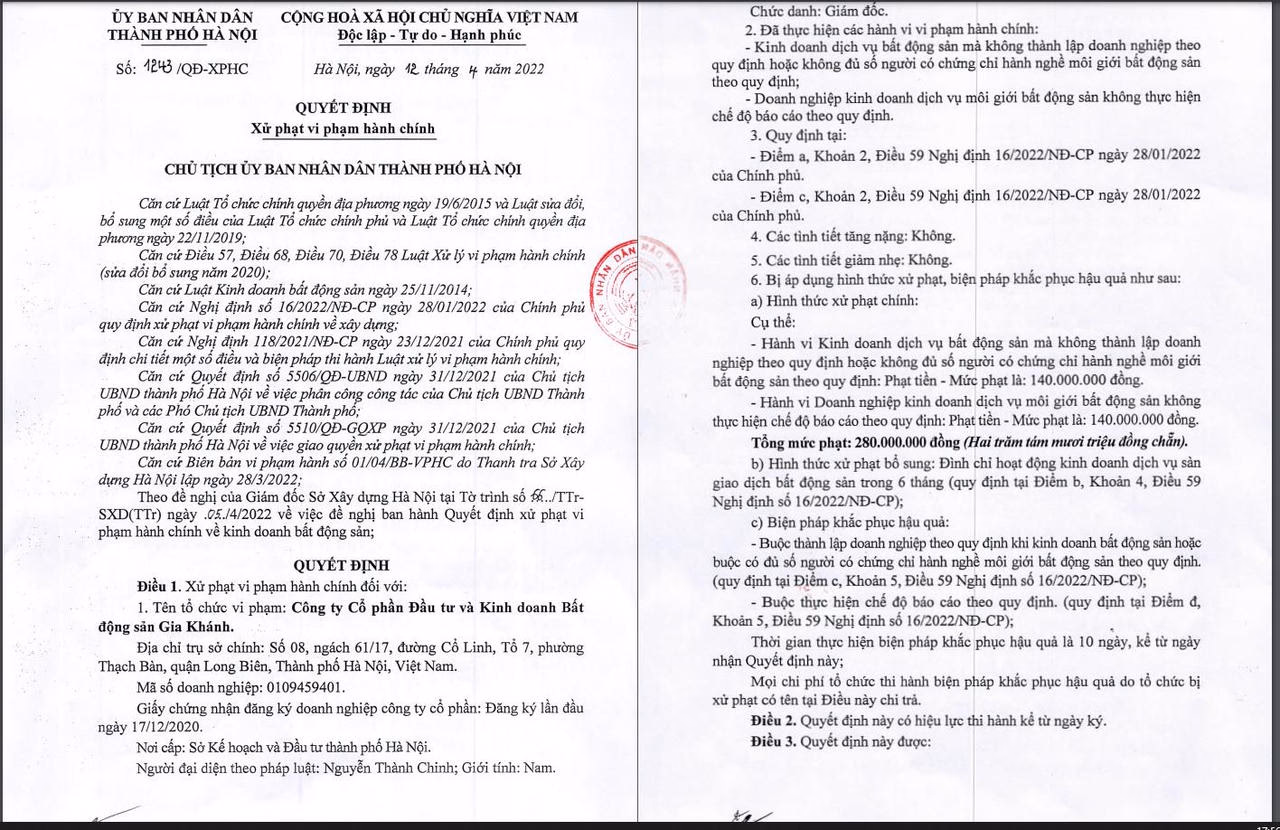 Cụ thể, tại Quyết định 1243/QĐ-UBND ngày 12/4/2022, UBND TP Hà Nội xử phạt Công ty cổ phần Đầu tư và Kinh doanh bất động sản Gia Khánh 280 triệu đồng và Quyết định 1244/QĐ-UBND ngày 12/4/2022, UBND TP xử phạt Công ty cổ phần Dịch vụ bất động sản Nhà đẹp giá gốc 140 triệu đồng.